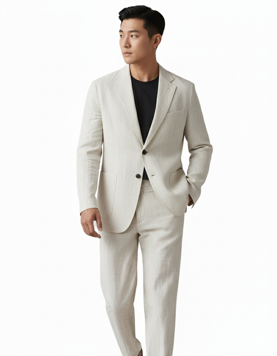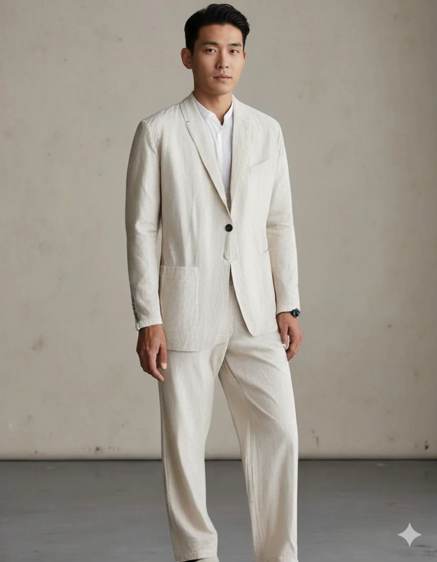 세련된 패션에 편안함을 추구하는 남성을 위해 제작된 세트. 통기성이 뛰어나고 가벼운 착용감을 제공하며, 따뜻한 계절의 이벤트, 휴가 또는 우아한 캐주얼 스타일에 적합합니다.