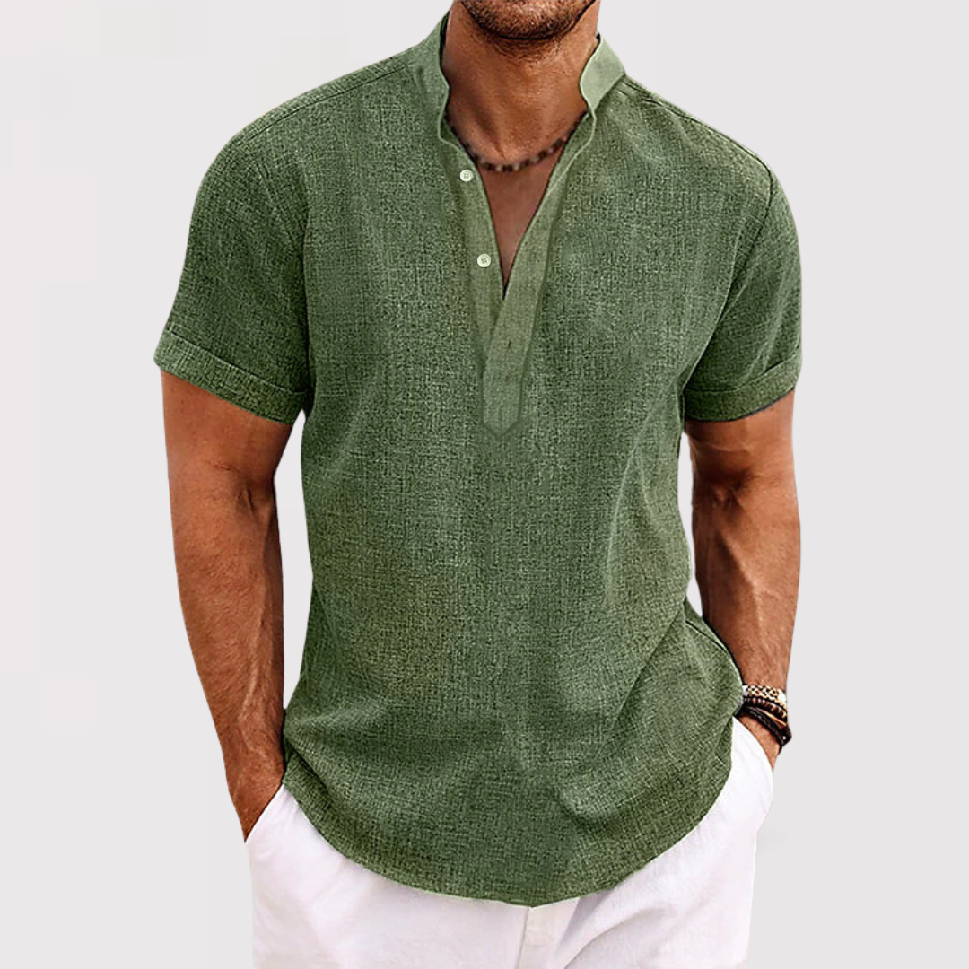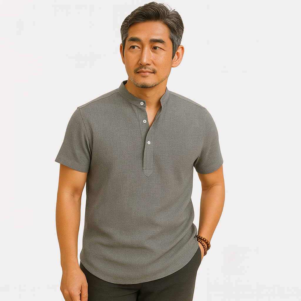 세련된 스타일을 손쉽게 즐길 수 있는 현대 남성을 위한 반팔 헨리넥 셔츠입니다.